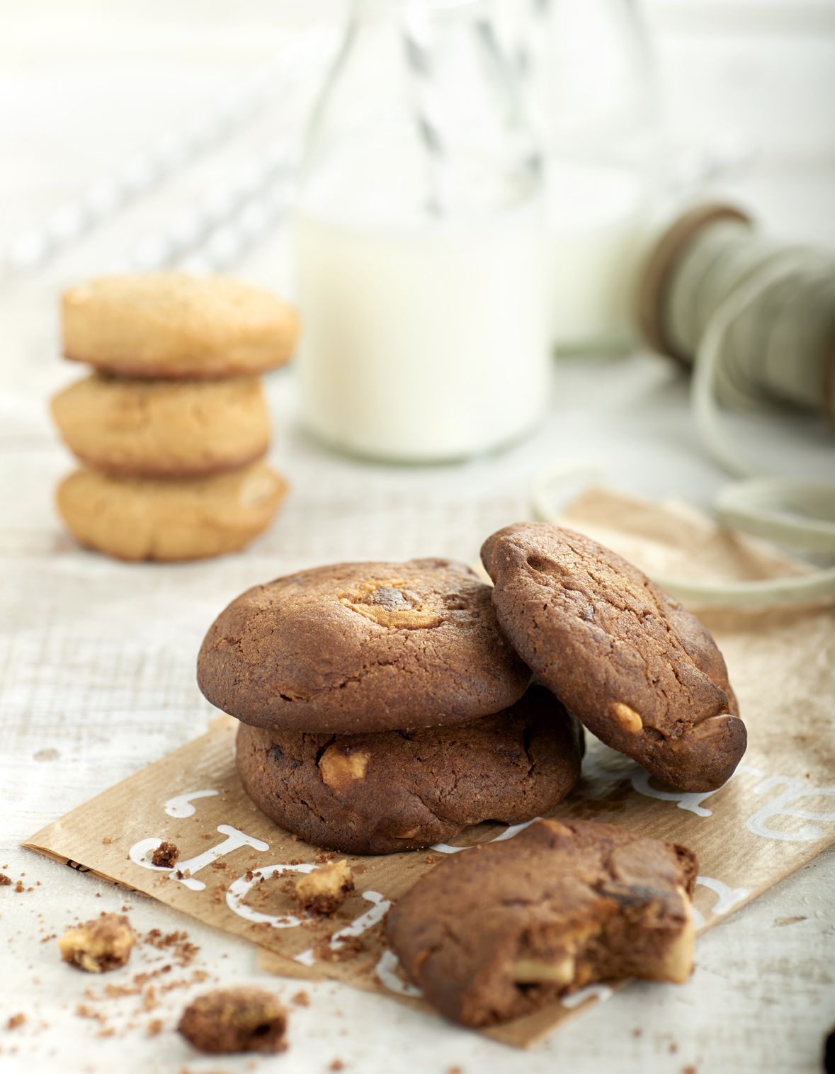 Podéis preparar las mismas cookies sin el cacao ni la leche y añadir chocolate negro, con leche y todo tipo de frutos secos sin tostar.