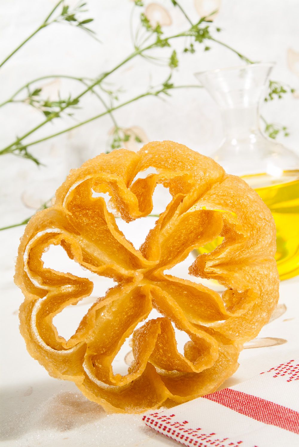 Fríe la floreta por ambos lados durante unos segundos y resérvala en un plato con papel de cocina. *Antes de hacer cada floreta, vuelve a bañar el molde en el aceite caliente para que la masa se adhiera a él.