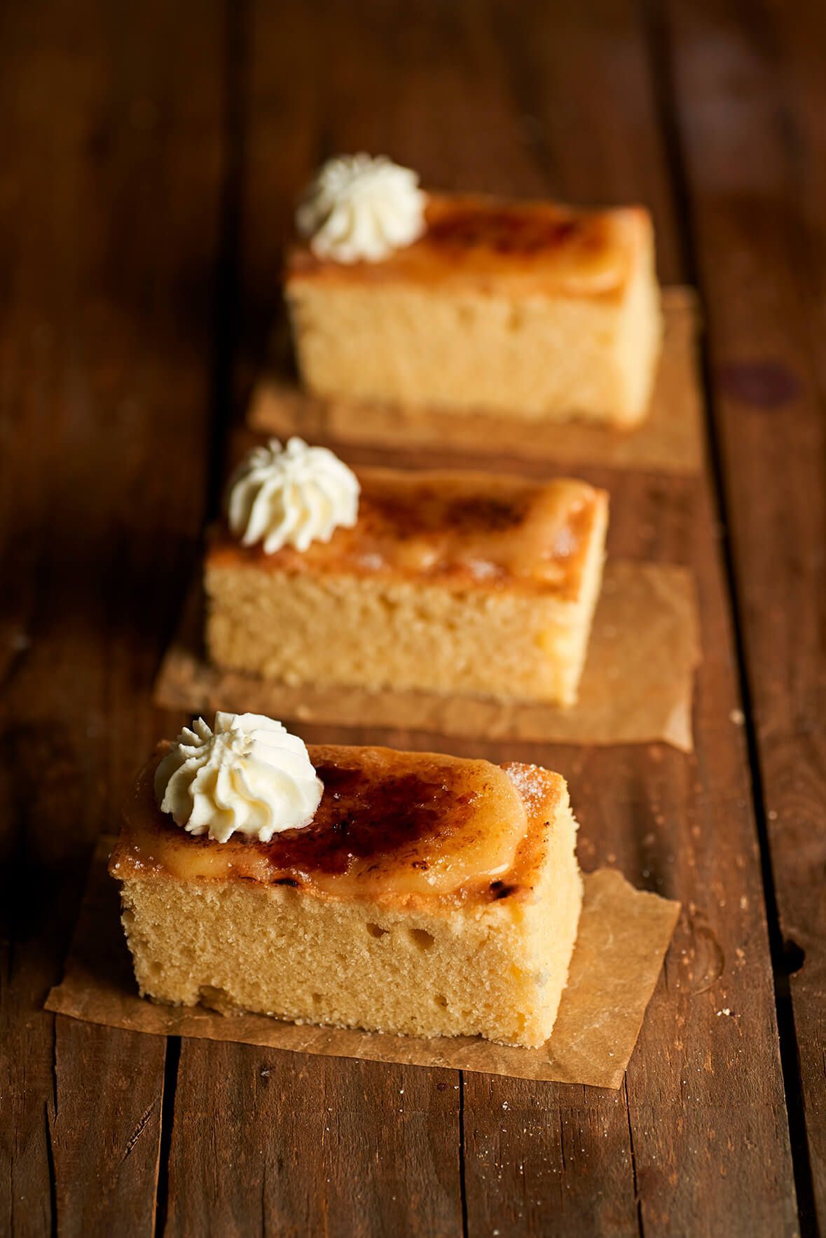 - Cortar el bizcocho en rectángulos de 8 x 3 cm., untar un poco de la yema en cada uno, espolvorear con los 25 g de azúcar restante y quemar con la ayuda de un soplete.