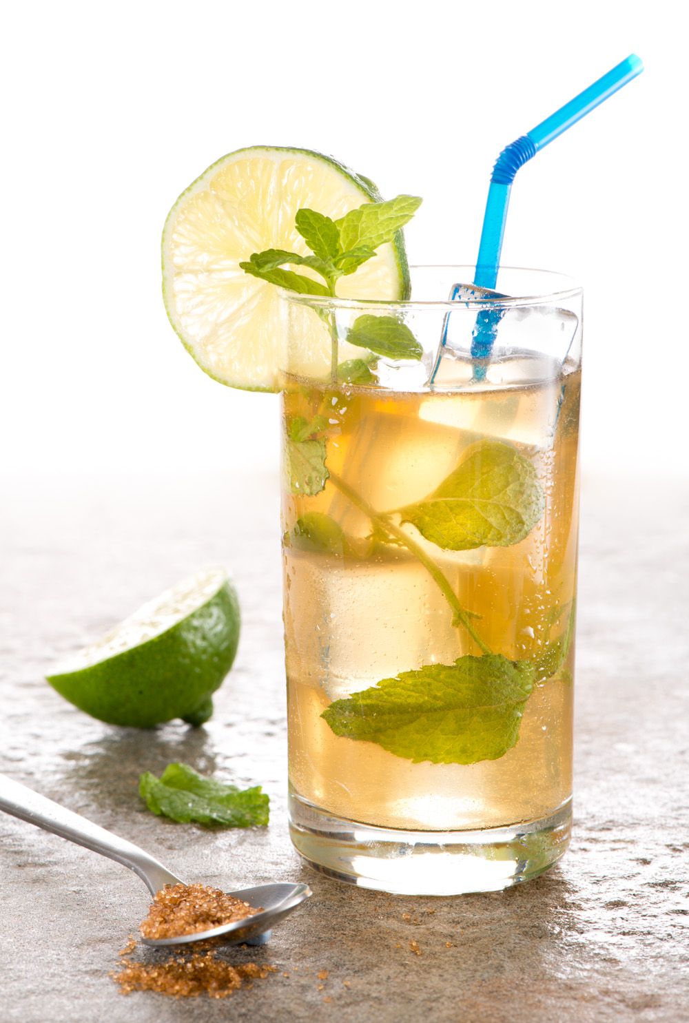 Remueve ligeramente el mojito con una cuchara alta y sírvelo, con una ramita de hierbabuena y una rodaja de lima.