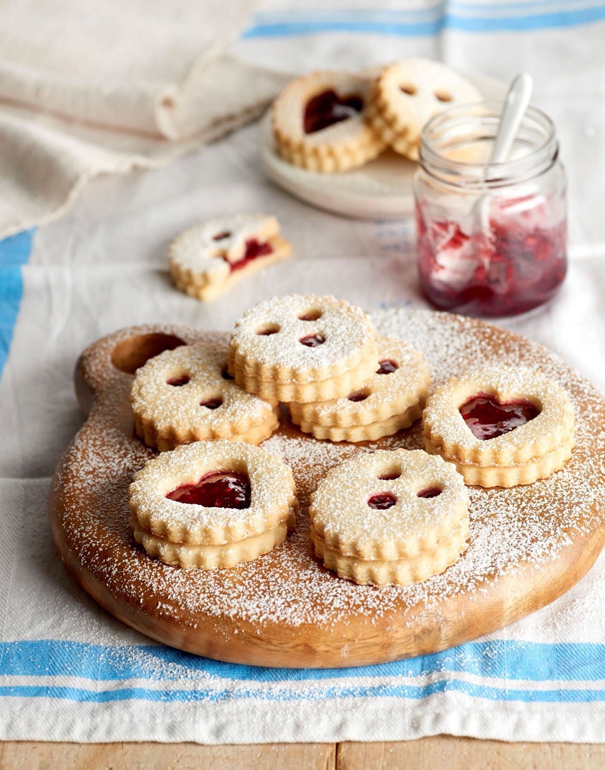 Cuando estén frías, cubrimos con mermelada las galletas sin agujeros y colocamos encima la galletas agujereadas. Por últimos, espolvoreamos con azúcar glace seda y ya están listas para servir y comer.