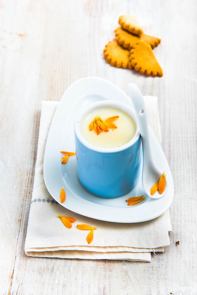 En nuestra imagen puedes ver las natillas decoradas con pétalos de caléndula, una flor comestible, y acompañadas por unas galletas de jengibre.