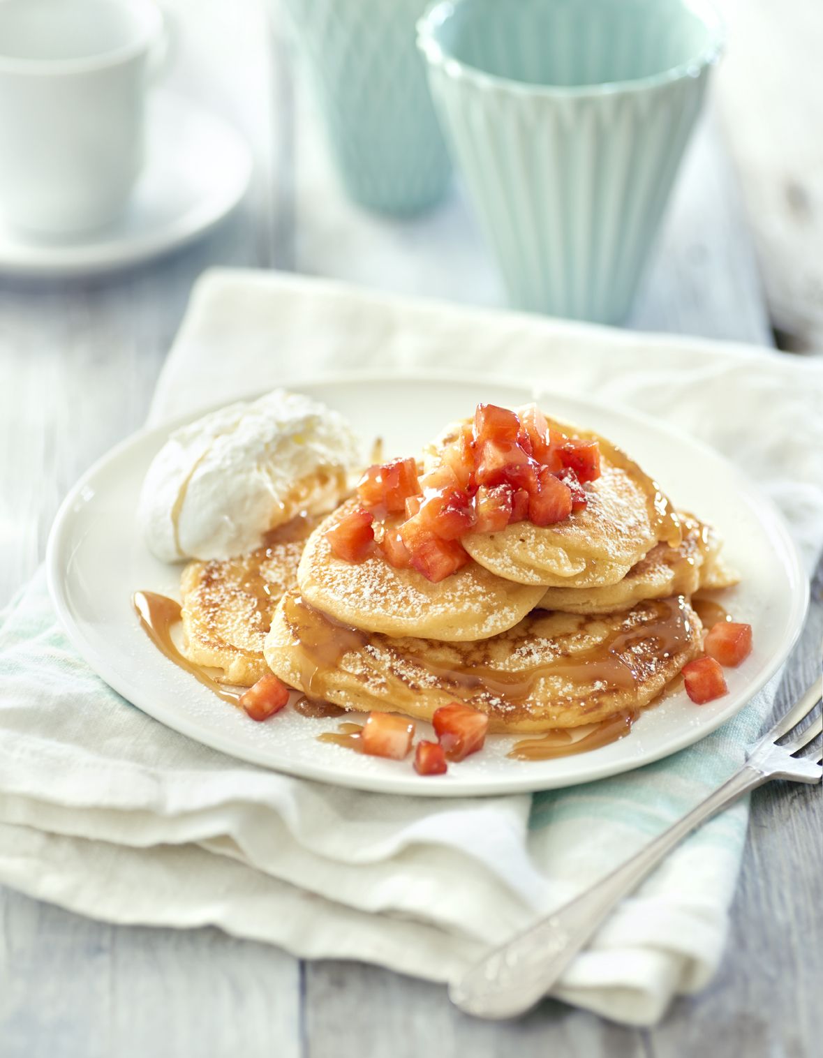 Comenzamos preparando el acompañamiento de nuestras tortitas. Para ello lavamos los fresones, eliminamos los rabillos y cortamos en dados pequeños. Los introducimos en un cuenco con 1 cucharada de azúcar Glace Seda y la mitad del zumo de limón, removemos y dejamos reposar.