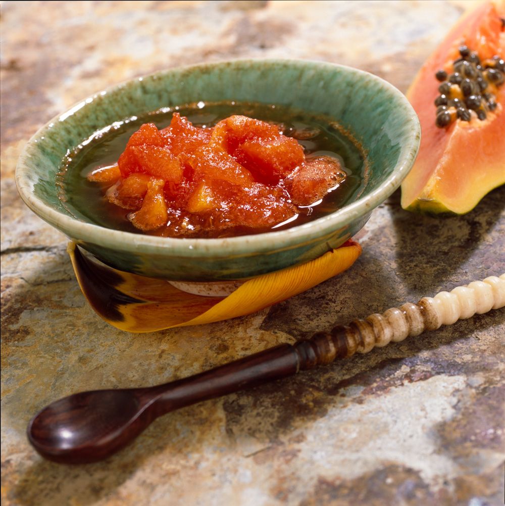 La papaya tiene muchas posibilidades en la cocina: puedes servirla laminada y rociada de zumo de lima, espolvoreada con azúcar moreno, como guarnición de un plato de carne, o incluso en batido. Otra opción es este dulce ligero que os proponemos.
