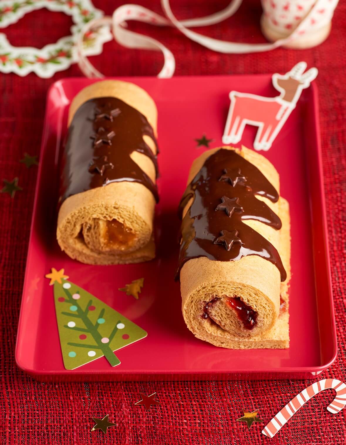 Para decorar: calienta la nata, viértela sobre el chocolate troceado y remueve. Coloca los rollitos sobre una fuente de servir, cubre con la salsa de chocolate y termina con las estrellas.