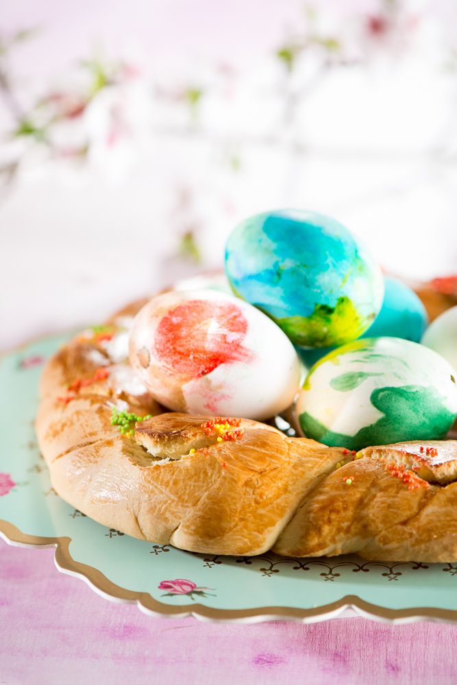 Sirve tu corona con los huevos decorados en el centro y prueba tu riquísima Mona de Pascua.