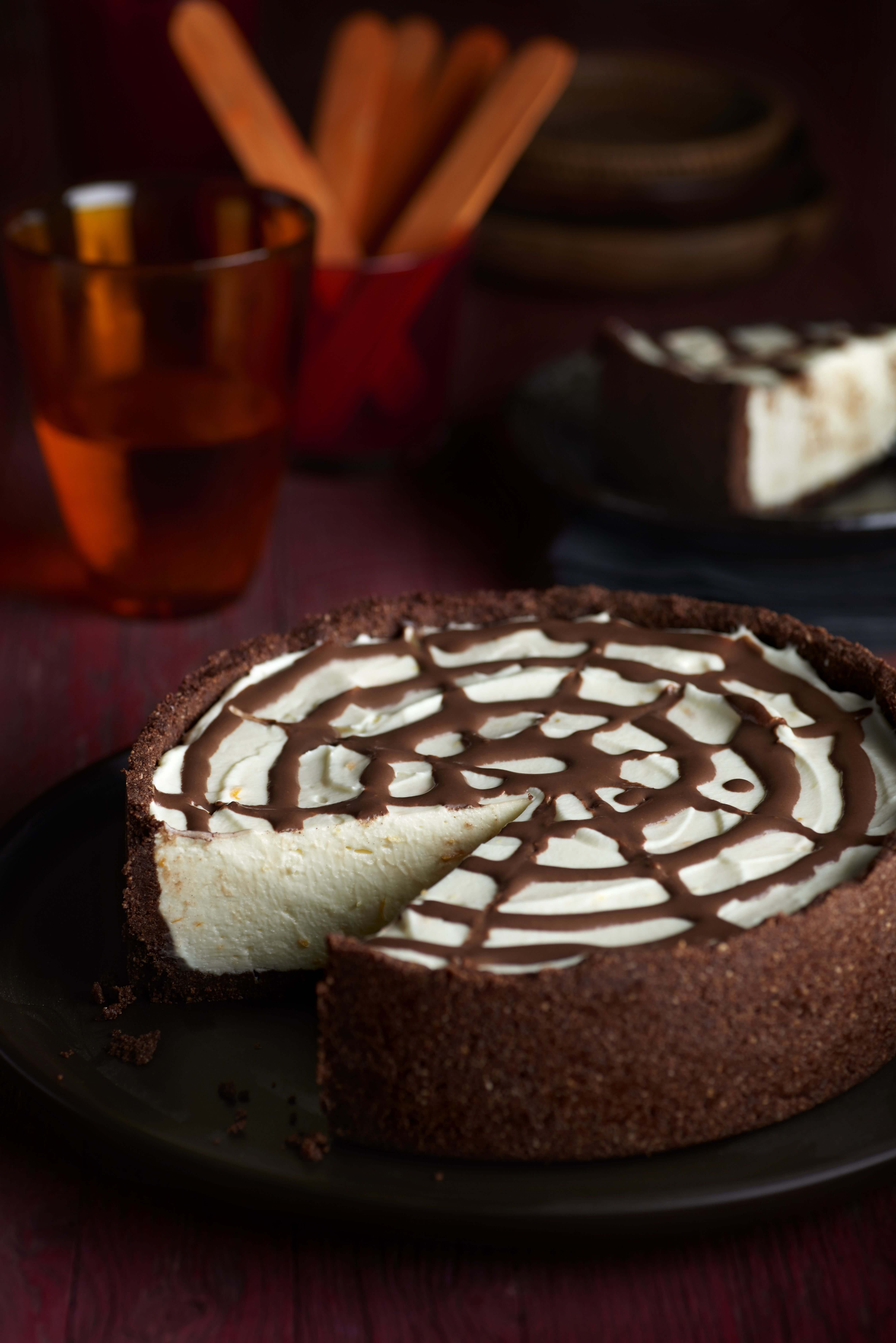 Por último, introducimos la salsa de chocolate ya fría en una pequeña manga y dibujamos una telaraña sobre la tarta. Dejamos reposar en la nevera durante 3-4 horas hasta que esté bien cuajado. Desmoldamos la tarta pasando un cuchillo por el lateral y ya la tenemos lista para servir.
