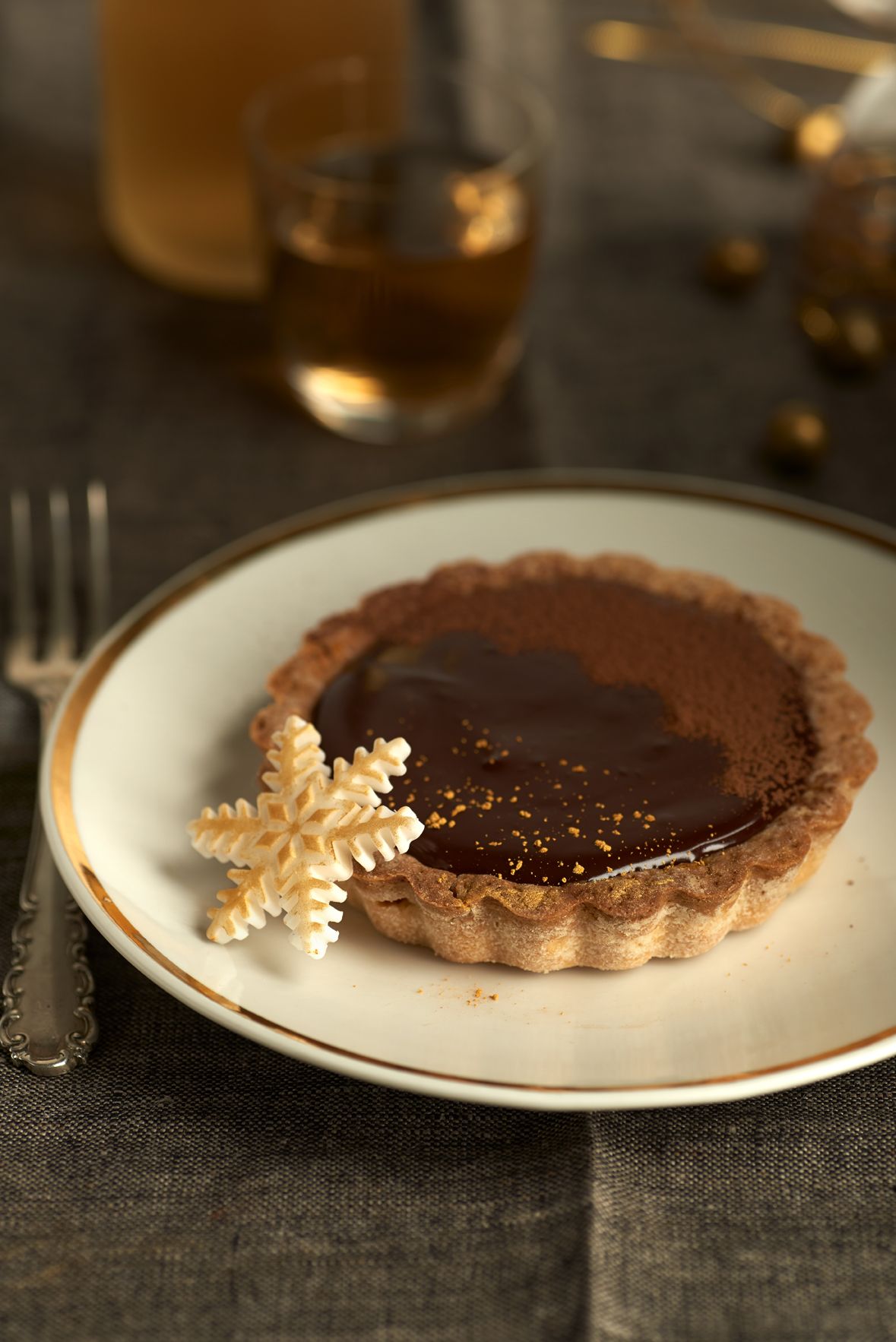 Como broche final, decoramos al gusto con estrellas de nieve de fondant y espolvoreando un poco de cacao y oro en polvo comestible sobre la tartaleta.