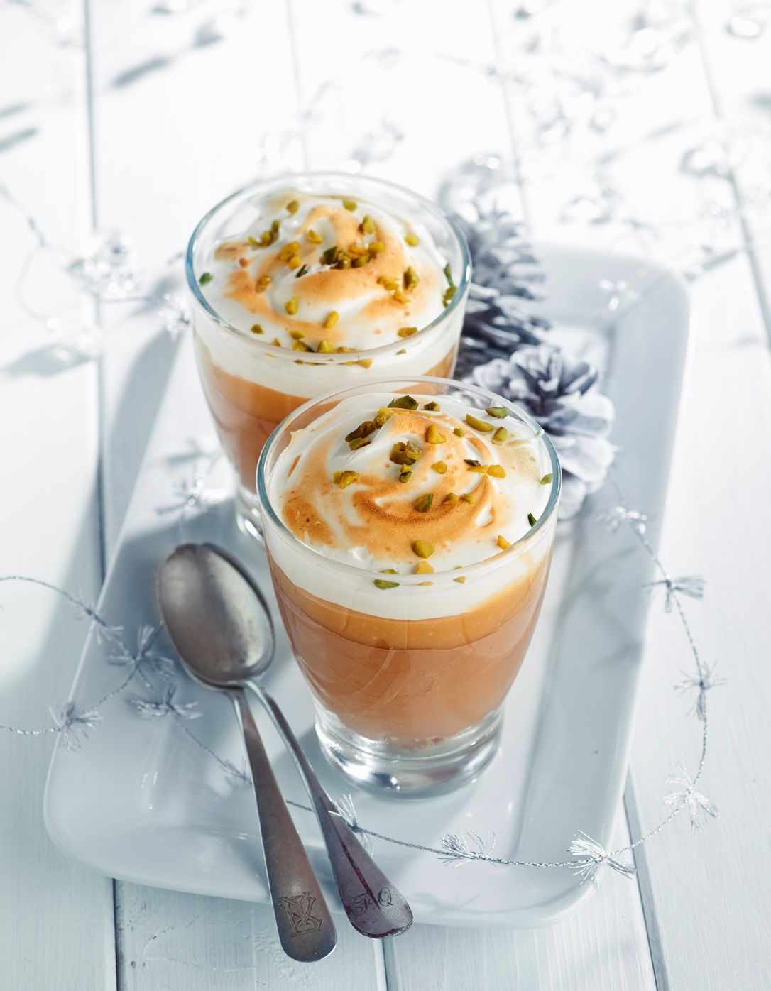 Para el merengue, monta la clara a punto de nieve con la ayuda de unas varillas. Agrega el azúcar Glace Seda poco a poco sin dejar de batir hasta obtener un merengue fuerte. Reparte sobre los vasos y si puedes, quema ligeramente con la ayuda de un soplete. Puedes decorarlo con unos pistachos.